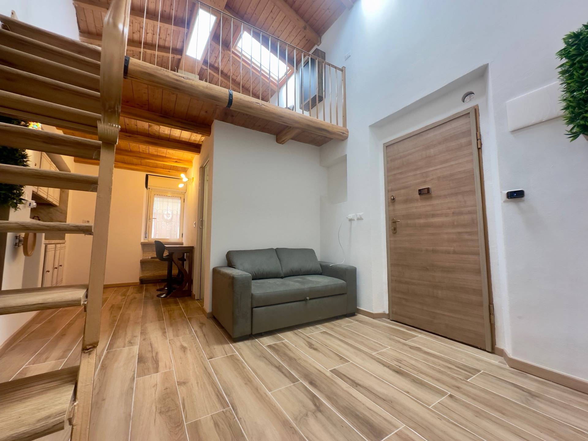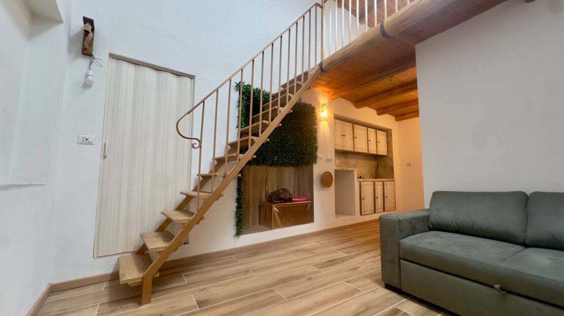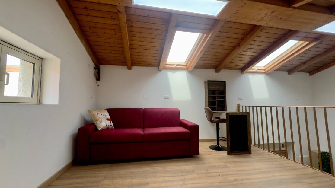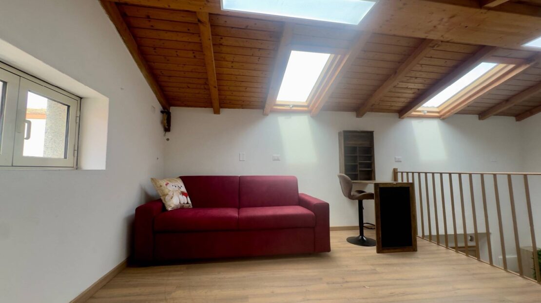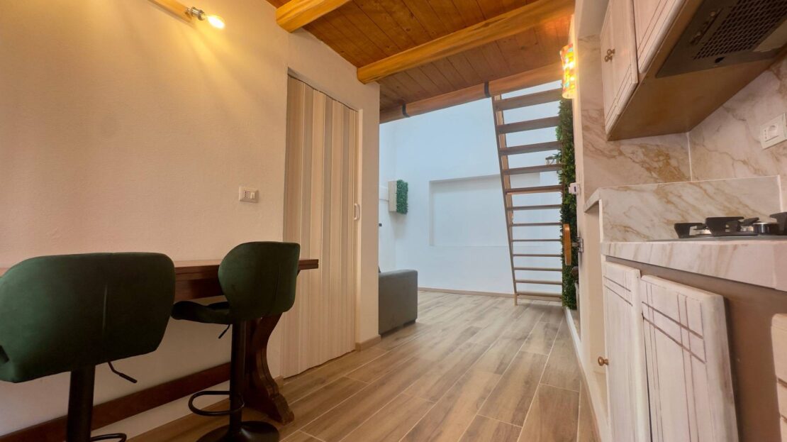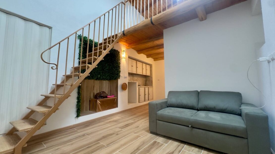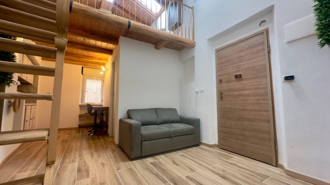 L’ingresso apre su un luminoso soggiorno con angolo cottura separato, bagno con antibagno e un elegante soppalco che ospita la camera matrimoniale.