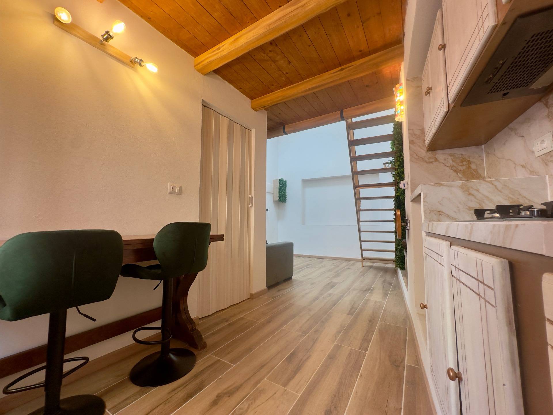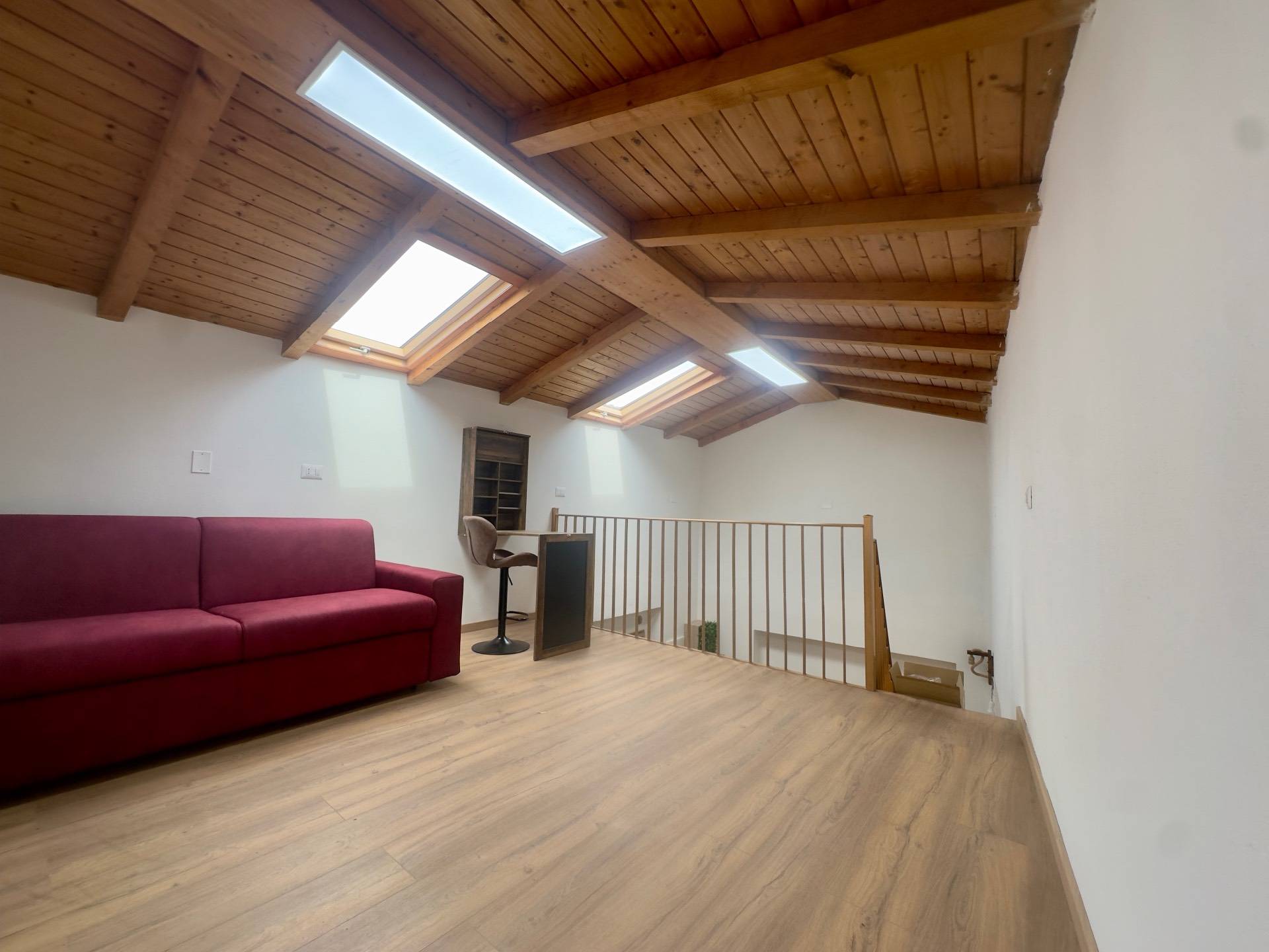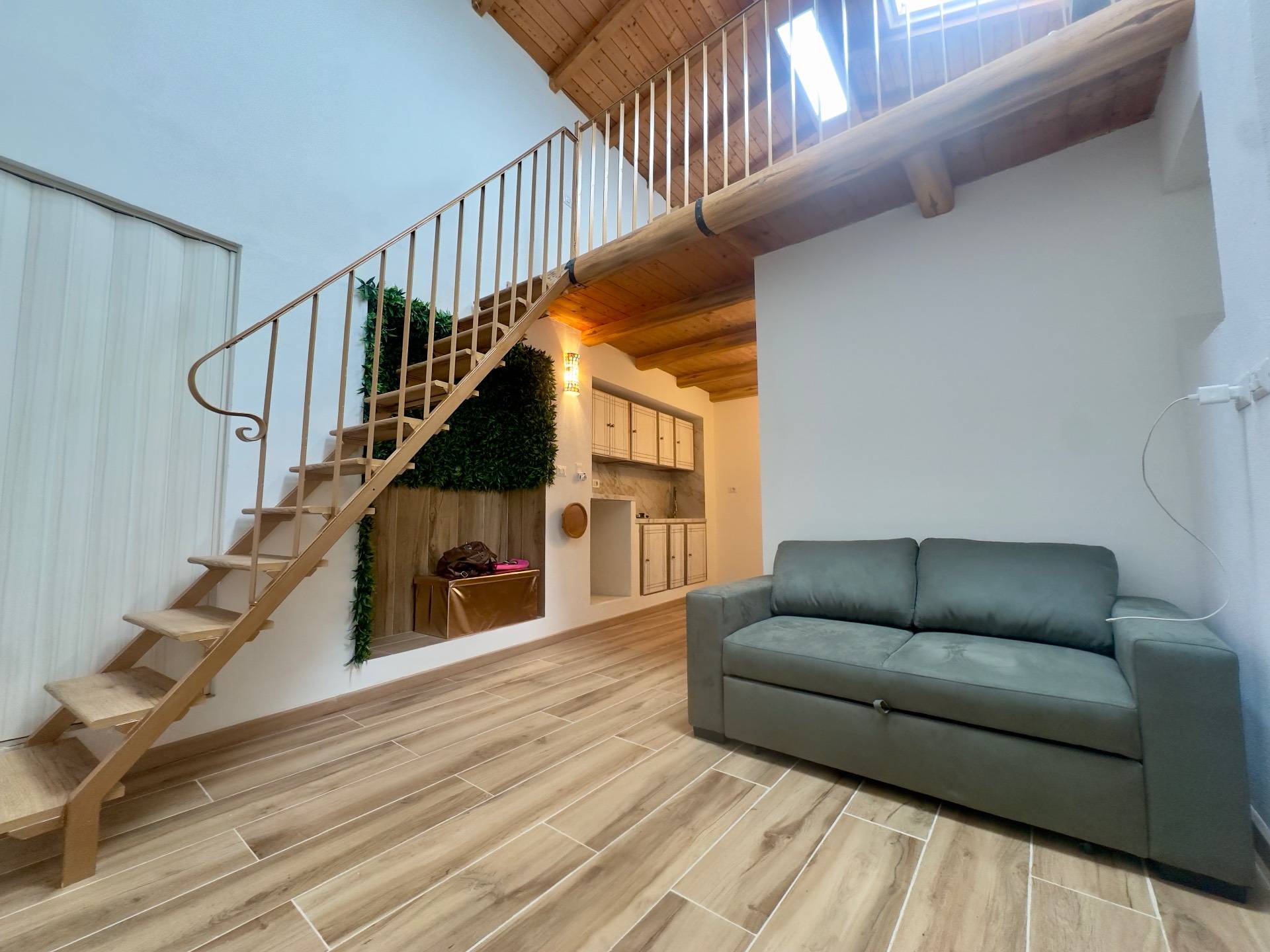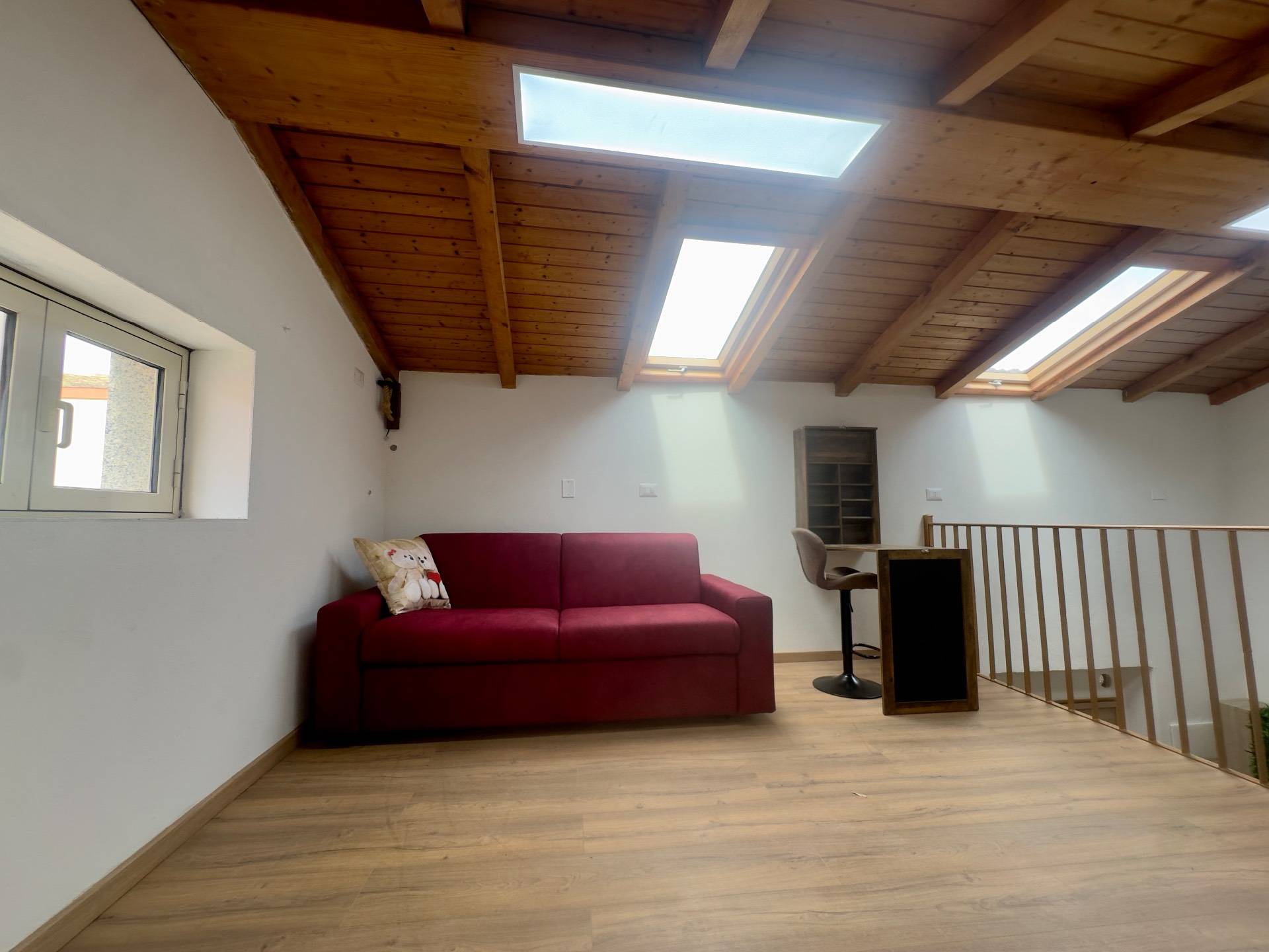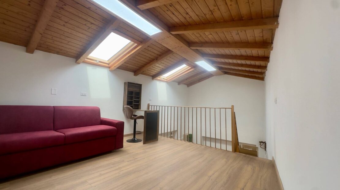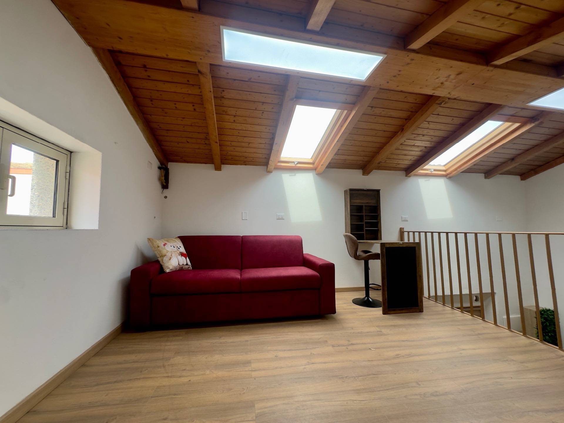 L’ingresso apre su un luminoso soggiorno con angolo cottura separato, bagno con antibagno e un elegante soppalco che ospita la camera matrimoniale.