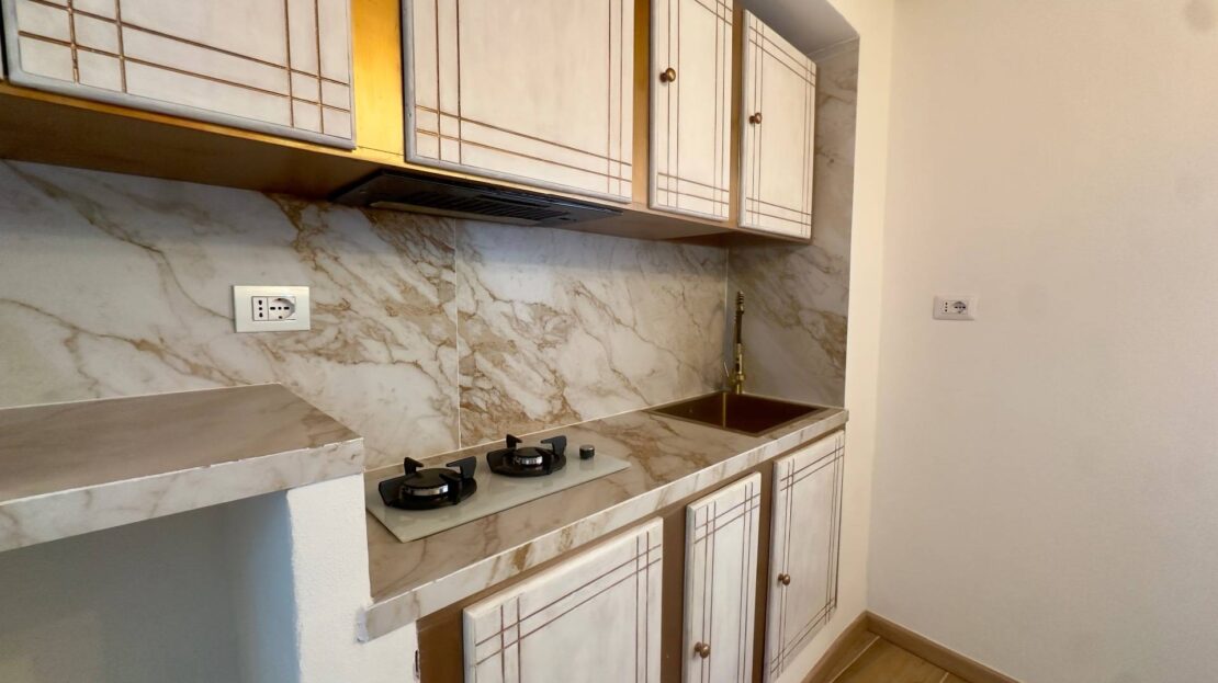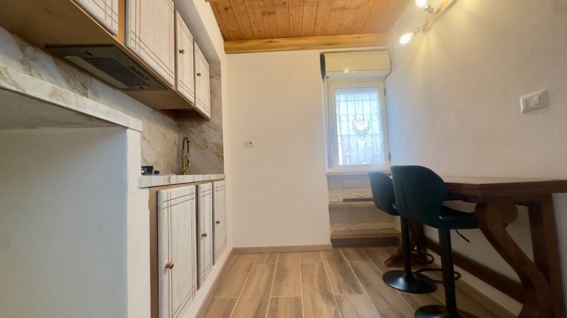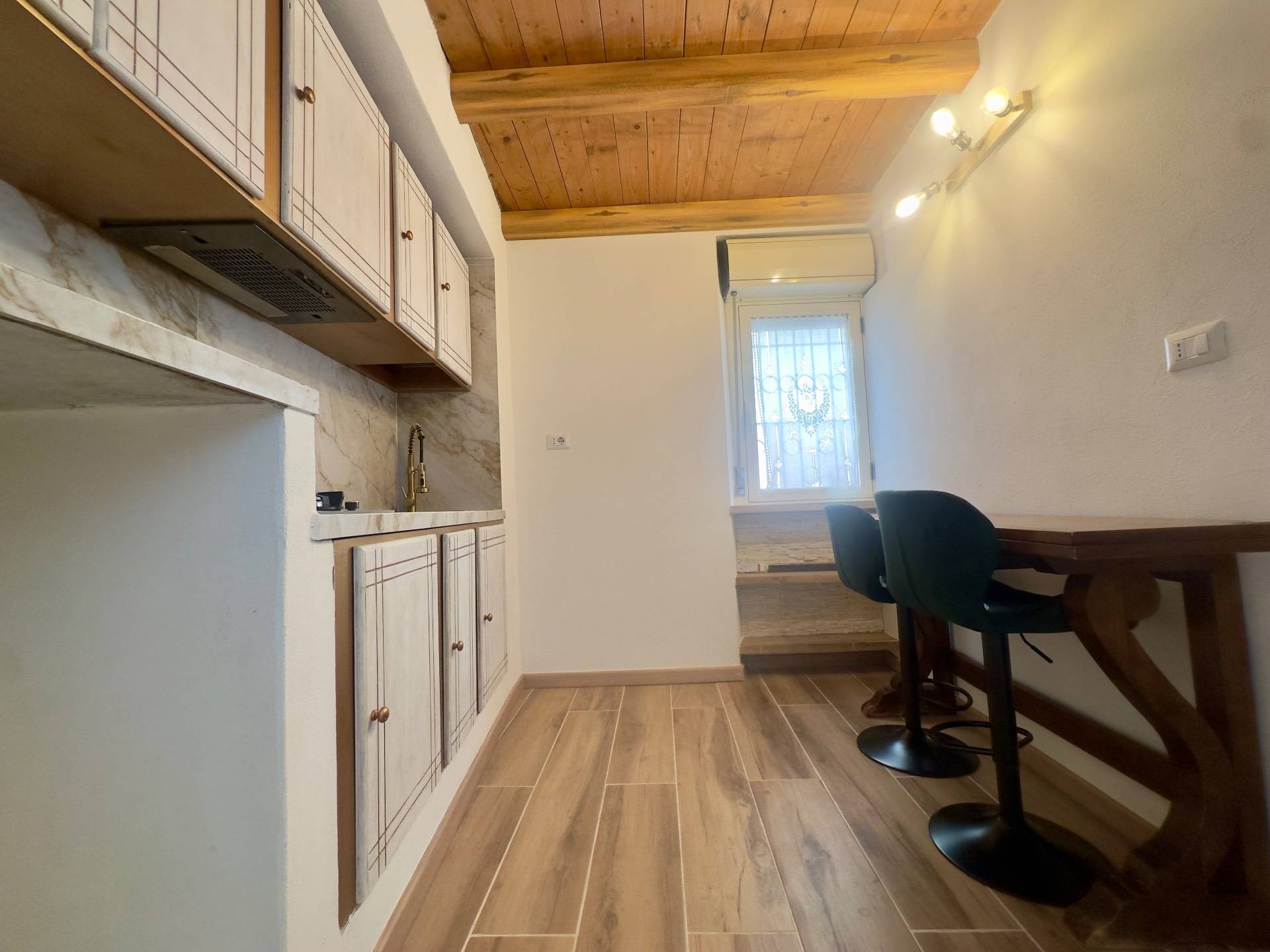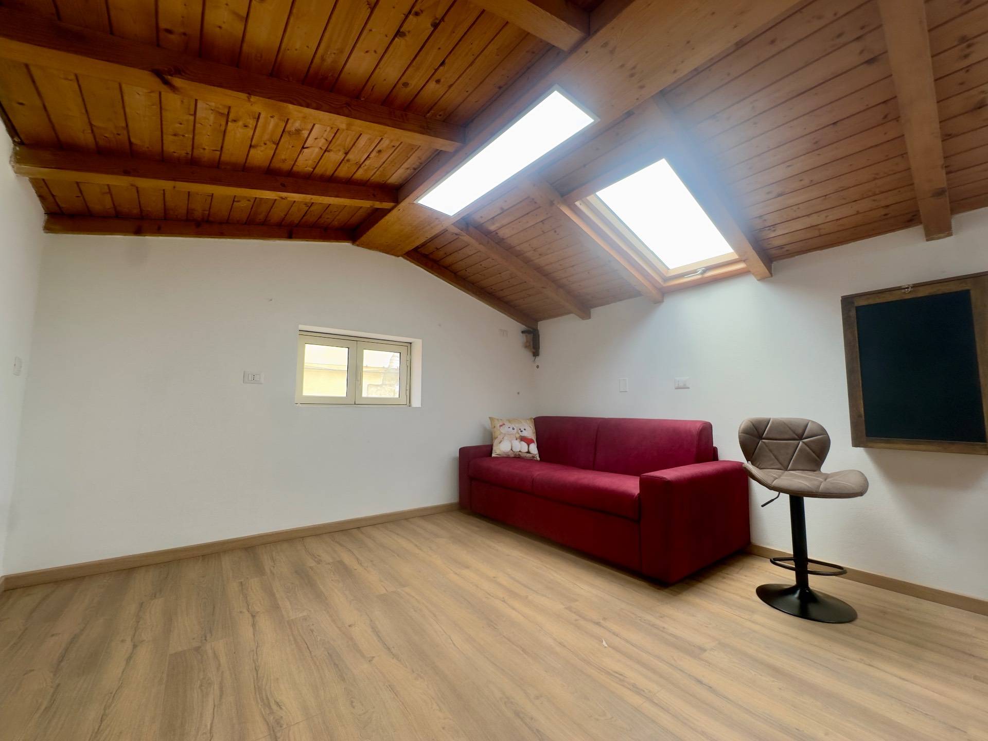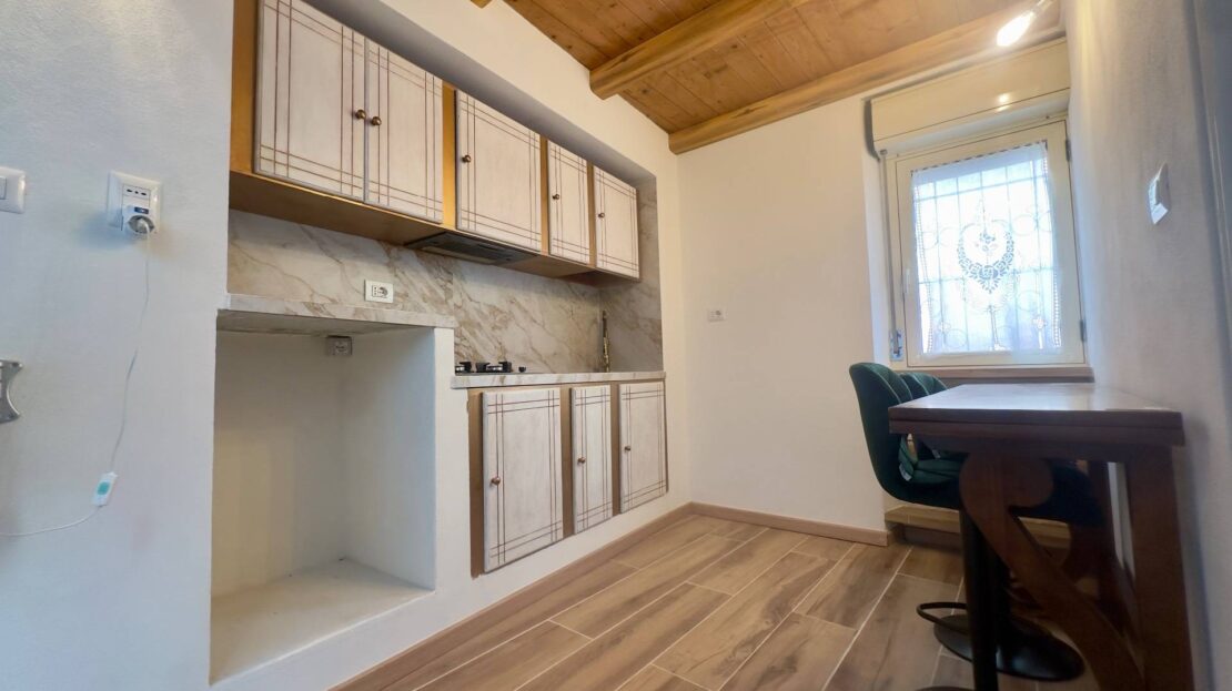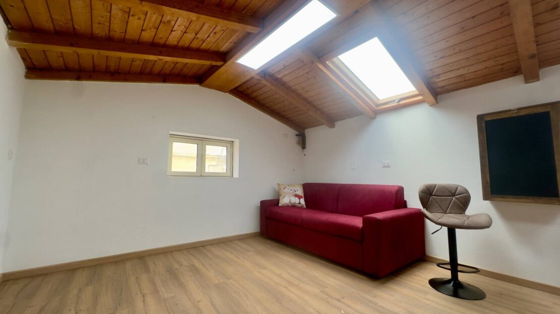 L’ingresso apre su un luminoso soggiorno con angolo cottura separato, bagno con antibagno e un elegante soppalco che ospita la camera matrimoniale.