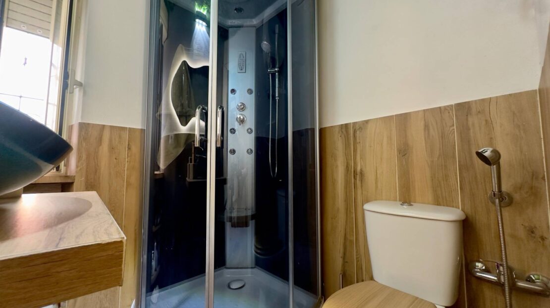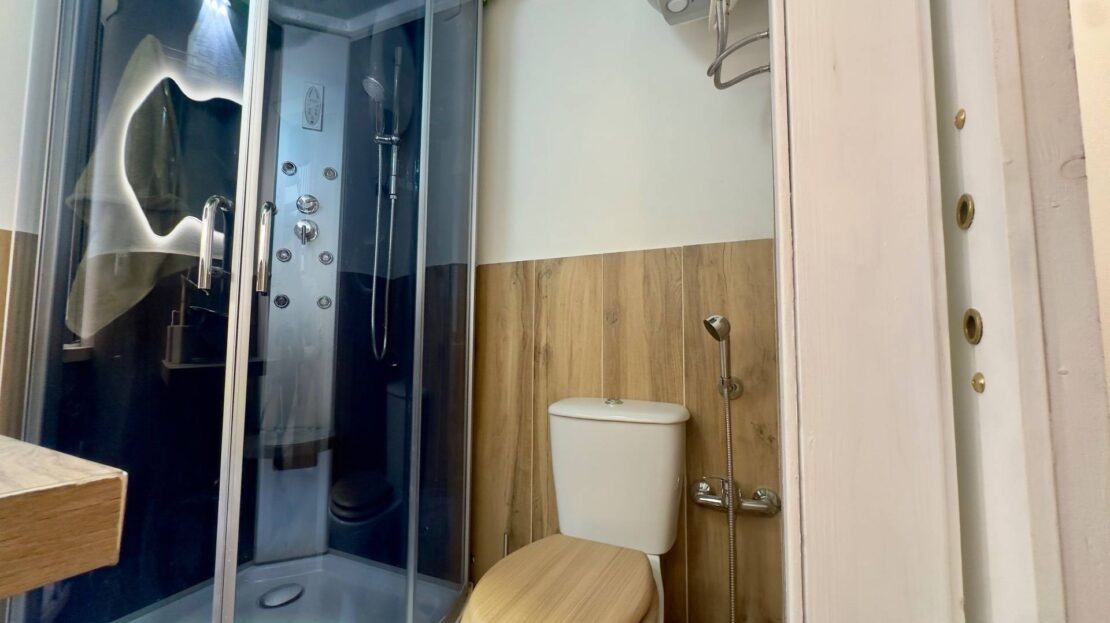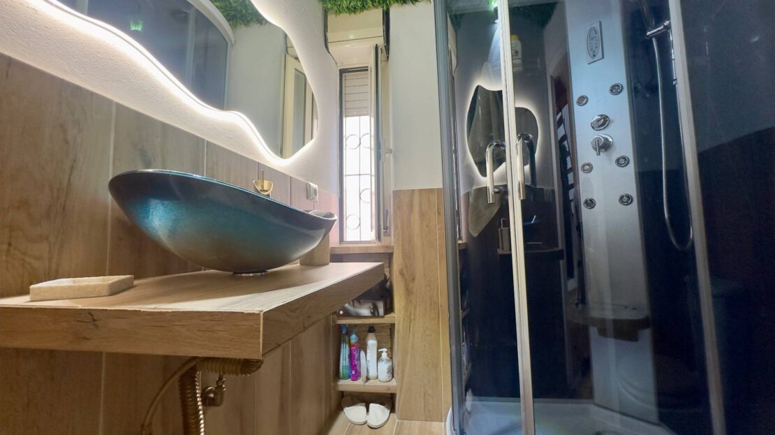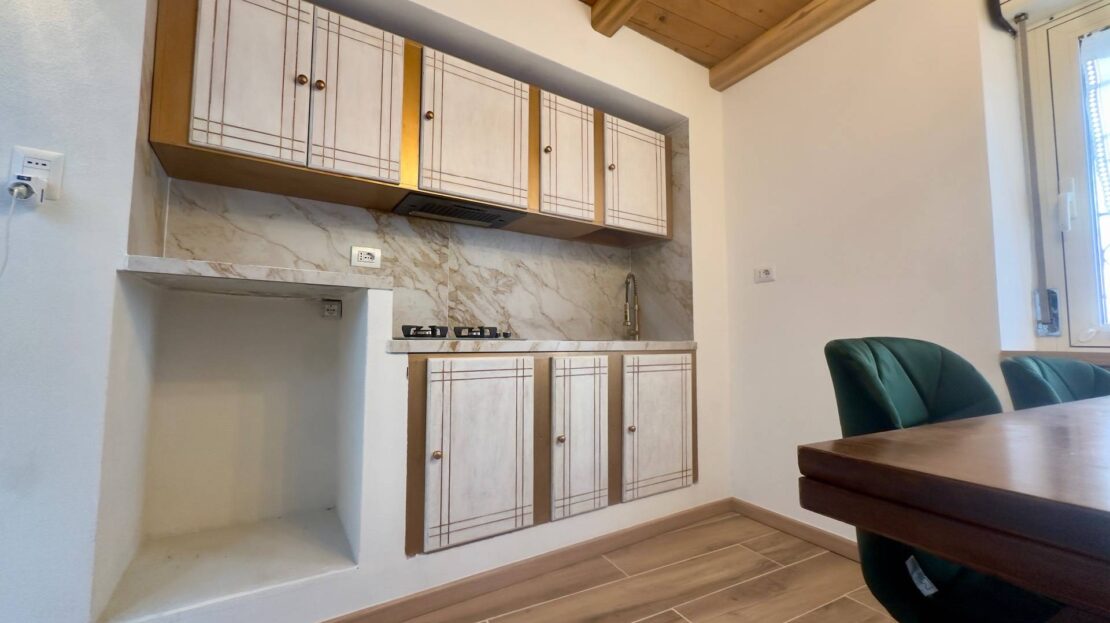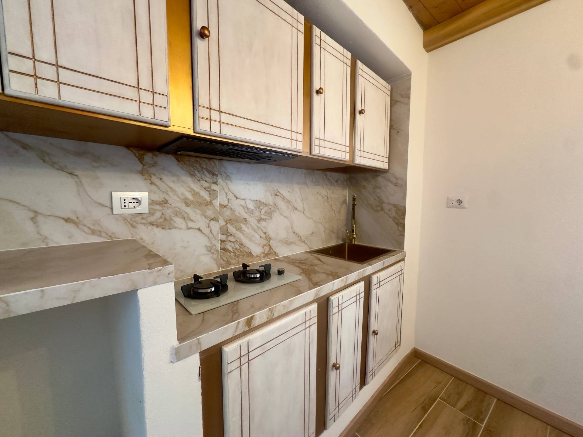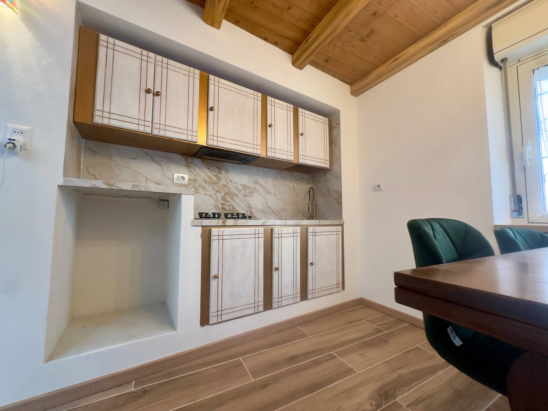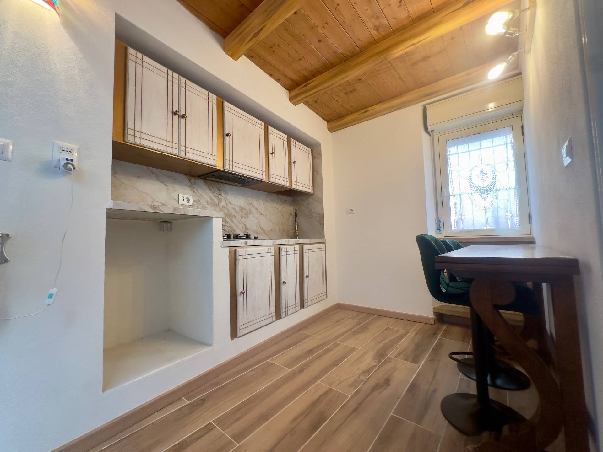 L’ingresso apre su un luminoso soggiorno con angolo cottura separato, bagno con antibagno e un elegante soppalco che ospita la camera matrimoniale.