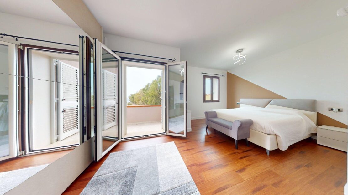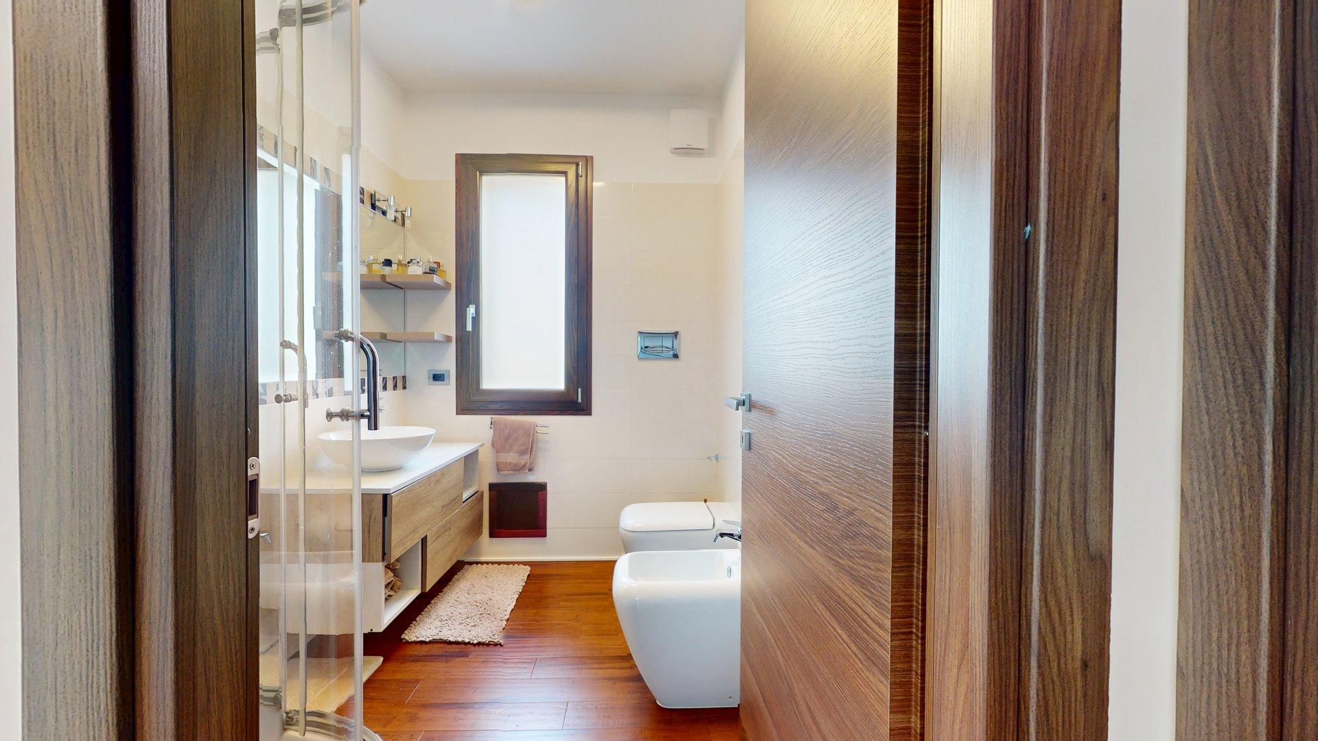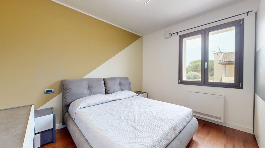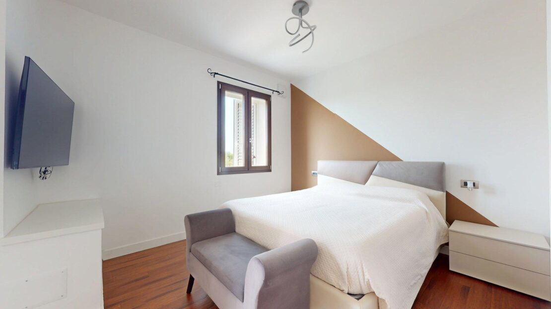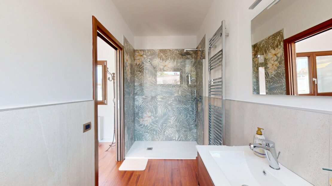 La zona notte, situata al piano superiore, è oggi composta da due ampie camere matrimoniali di generose dimensioni. Originariamente tre, le stanze sono state ripensate e ridistribuite: due camere sono state fuse per creare un’unica, straordinaria matrimoniale doppia, che regala spazi ariosi e un comfort superiore. A completare il piano, un secondo bagno con doccia arricchito da finiture di pregio.