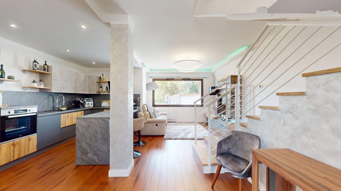 Al piano terra domina la zona living open space, luminosa e accogliente, con cucina a vista e soggiorno che dialogano con l’esterno grazie alle ampie aperture sulla veranda coperta, vero cuore della casa, ideale per pranzi conviviali e momenti di relax. Sullo stesso livello si trova un bagno completo di doccia, moderno ed elegante.