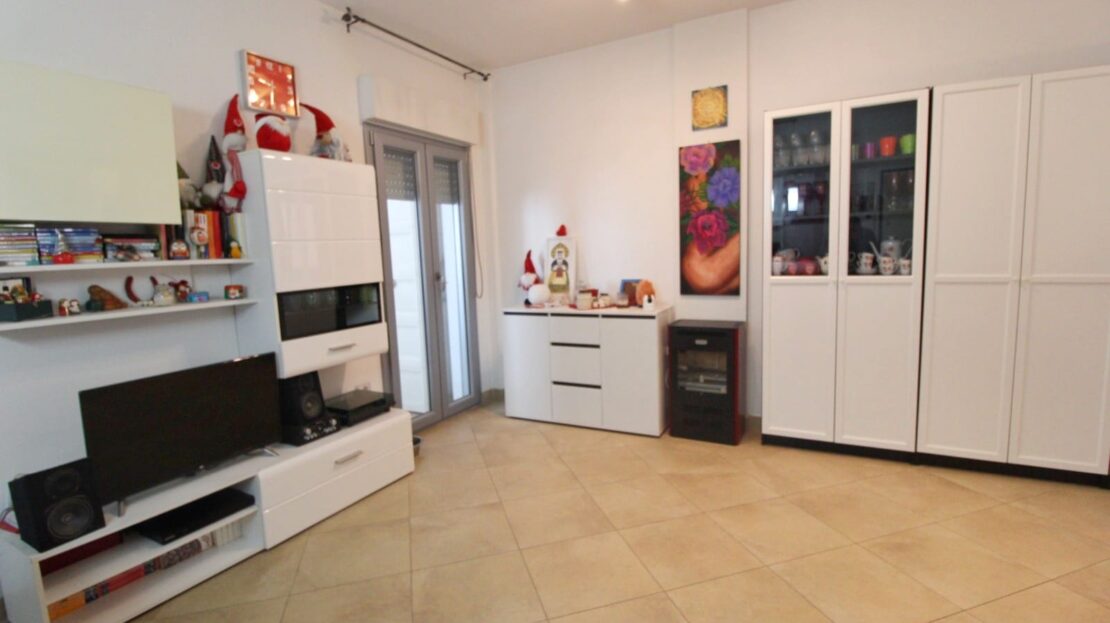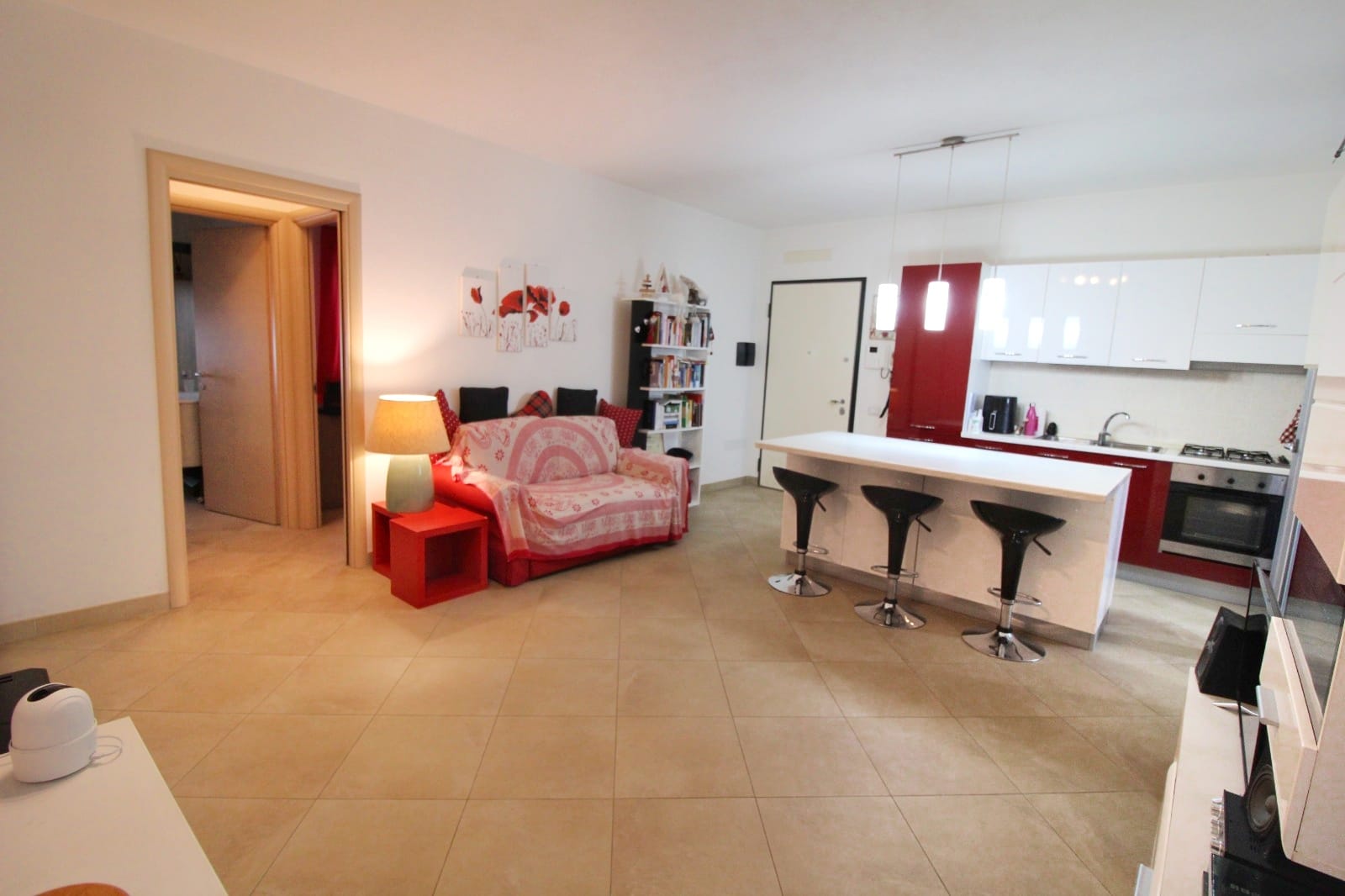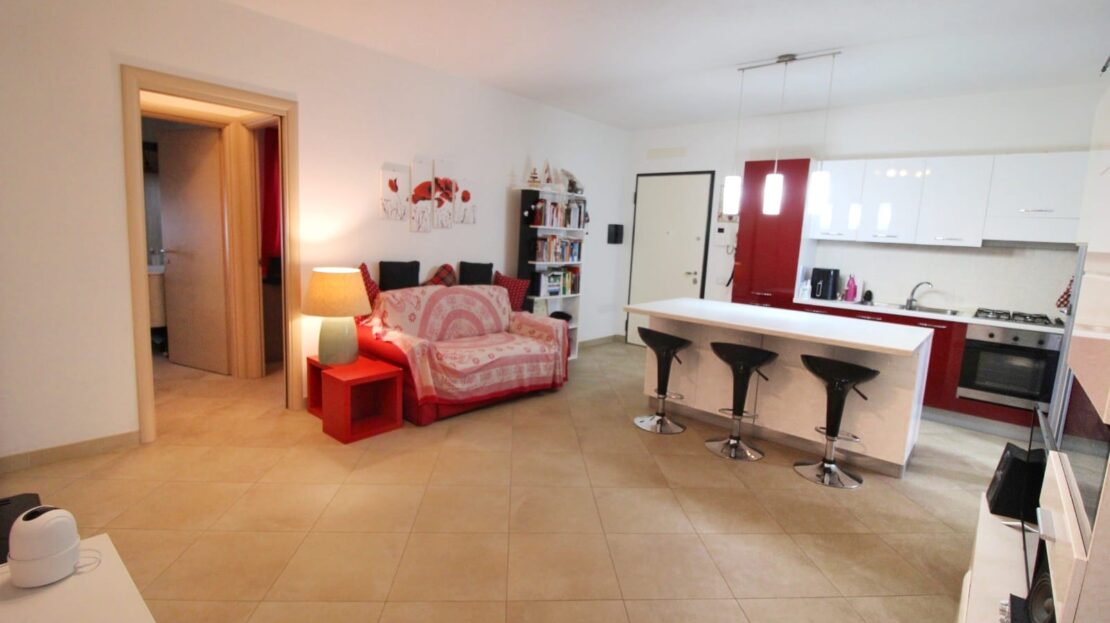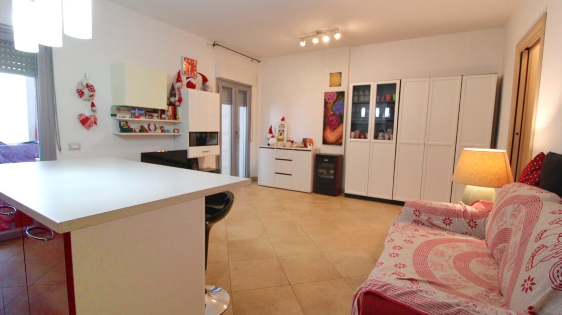 L’ingresso si apre su un ampio soggiorno con una moderna cucina a vista, un ambiente funzionale e ben distribuito.