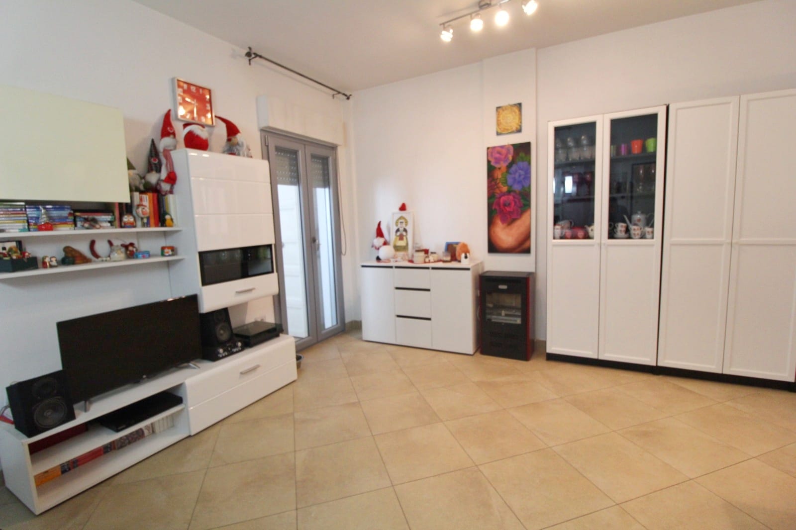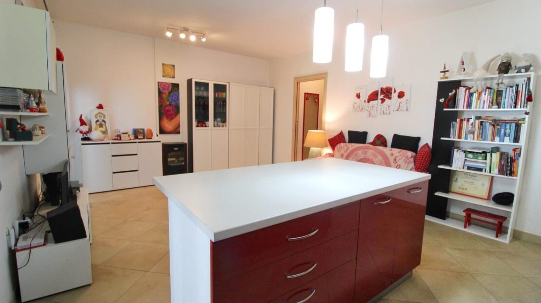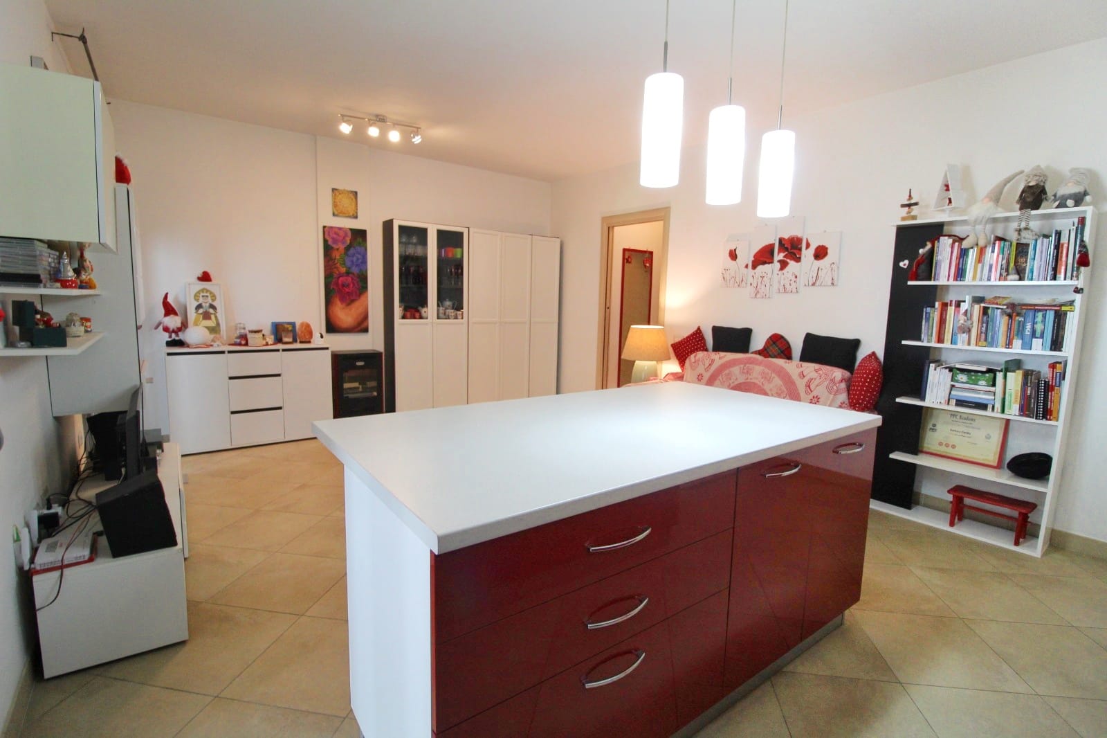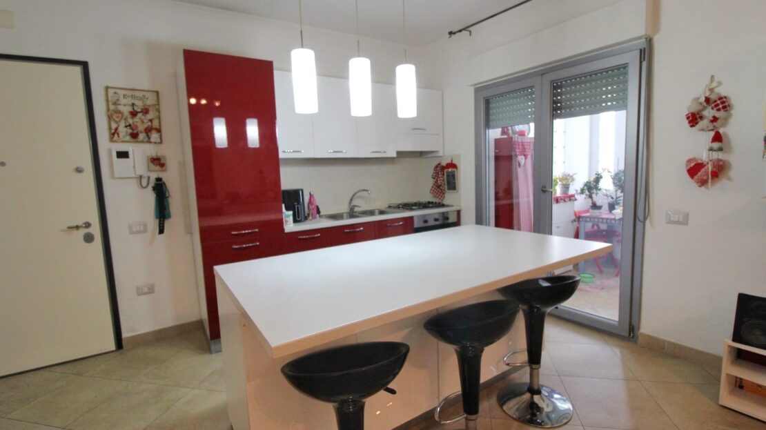 L’ingresso si apre su un ampio soggiorno con una moderna cucina a vista, un ambiente funzionale e ben distribuito.